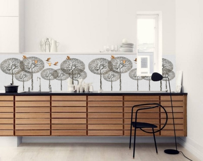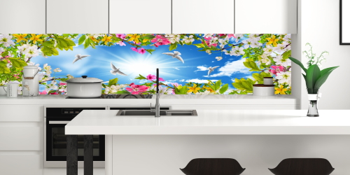 3Boyutlu Kendinden Yapışkanlı Beyaz Kuş Mavi Gökyüzü Renkli Çiçekli Yapraklı Model Mutfak Arası Folyo Kaplama