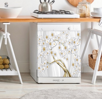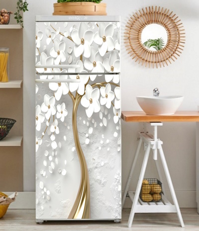 Kendinden Yapışkanlı Beyaz Eşya Kaplama Folyosu Taş Detaylı Beyaz Çiçekli Ağaç Model