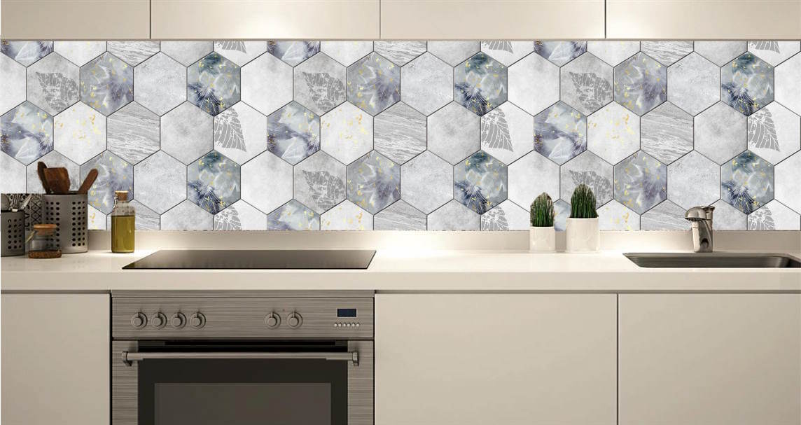 KENDİNDEN YAPIKANLI - ÖZEL TASARIM ÇİNİ MERMER GEOMETRİK DESEN 3D MUTFAK ARASI SERAMİK ÜSTÜ FOLYO KAPLAMA