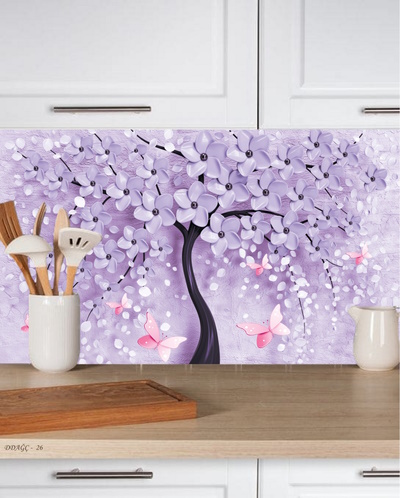 3Boyutlu Kendinden Yapışkanlı Tezgah Arası Folyo Kaplama Mor Çiçekli Ağaç Model