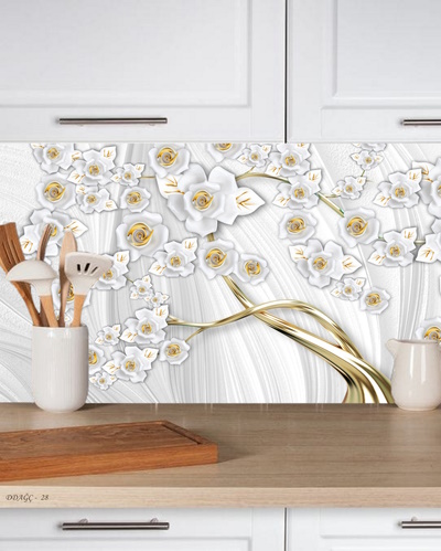 3Boyutlu Kendinden Yapışkanlı Tezgah Arası Folyo Kaplama Beyaz Çiçekli Gold Ağaç Model