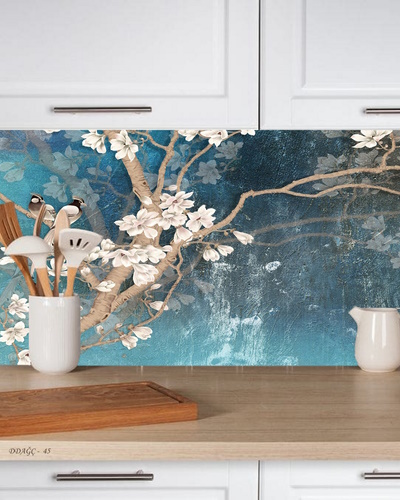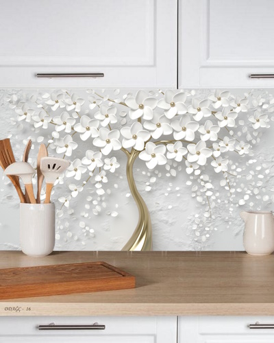 3Boyutlu Kendinden Yapışkanlı Tezgah Arası Folyo Kaplama Beyaz Çiçekli Ağaç Vlntage Model
