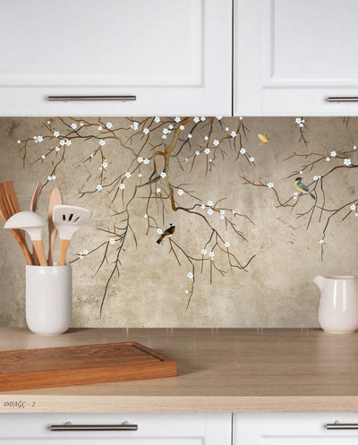 3Boyutlu Kendinden Yapışkanlı Tezgah Arası Folyo Kaplama Kahverengi Beyaz Çiçekli Ağaç Kuş Model