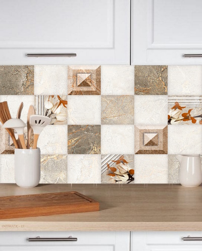 3Boyutlu Kendinden Yapışkanlı Krem Kahverengi Taş Desenli Etnik Yaprak Model Mozaik Tezgah Arası Folyo Kaplama